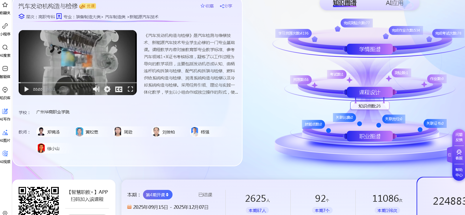 《汽车发动机构造与检修》课程全力打造“专思互融·三阶递进·多元评价”课程思政建设模式。以专业知识为载体,以思政教育为灵魂,校企开发数字化思政资源56个,将“工匠精神”“创新意识”“工程伦理”等思政元素深度融入课堂教学。课程MOOC选课超2538人次,数字化资源实现跨校共享,覆盖92个单位,扩大了示范辐射效应。同时依托课程建设,发表学术论文2篇,出版教材2本,申请发明专利1项(已授权),指导学生参加省级竞赛获奖2项,课程建设成果丰硕,育人成效显著。