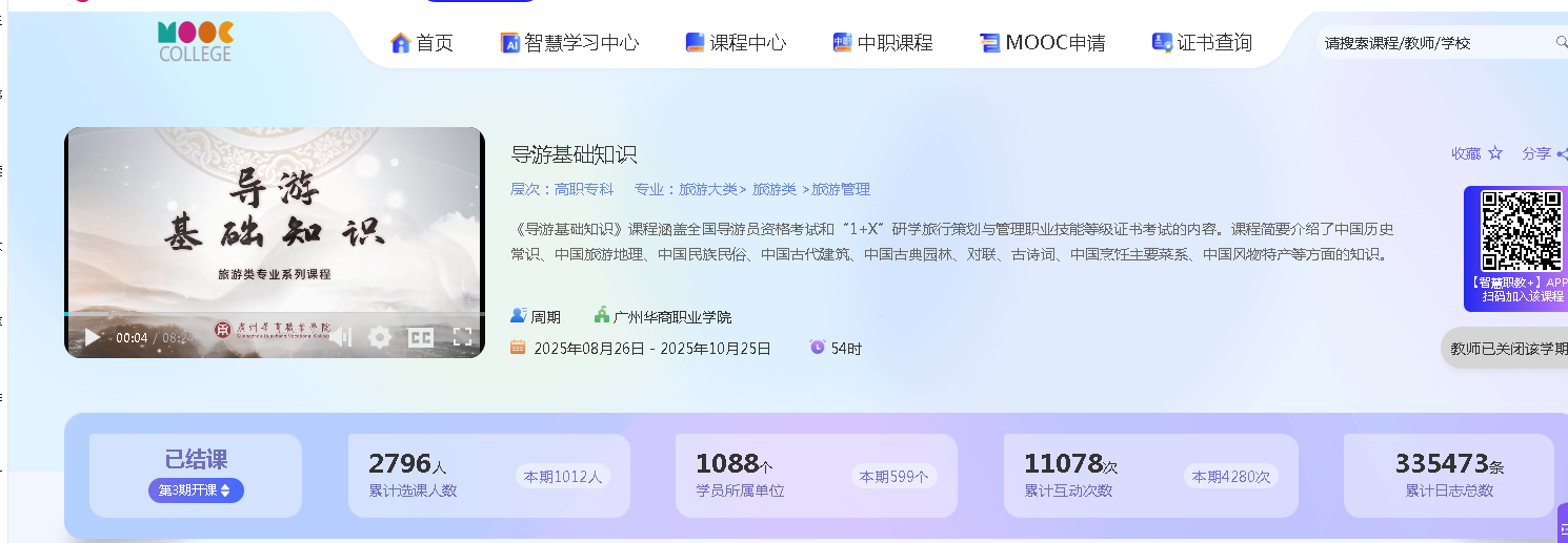 《导游基础知识》课程构建“双线融合·三阶递进·双效共生”育人模式,深挖文旅行业思政内核,制作原创教学资源66个,MOOC平台累计选课1784人次,指导学生斩获省级以上竞赛奖项9项。成果已在广东酒店管理职业技术学院、广东新安职业技术学院等多所兄弟院校推广,具有较强的示范引领作用。